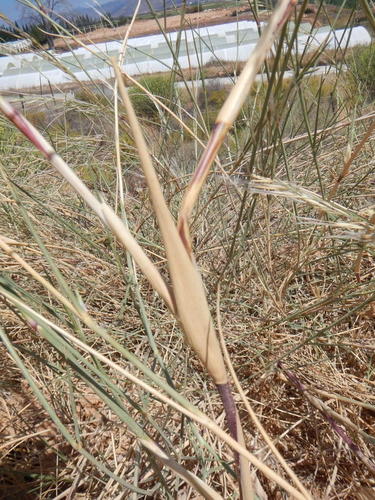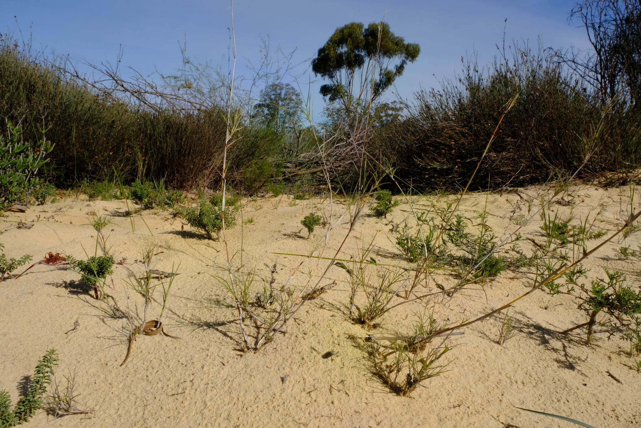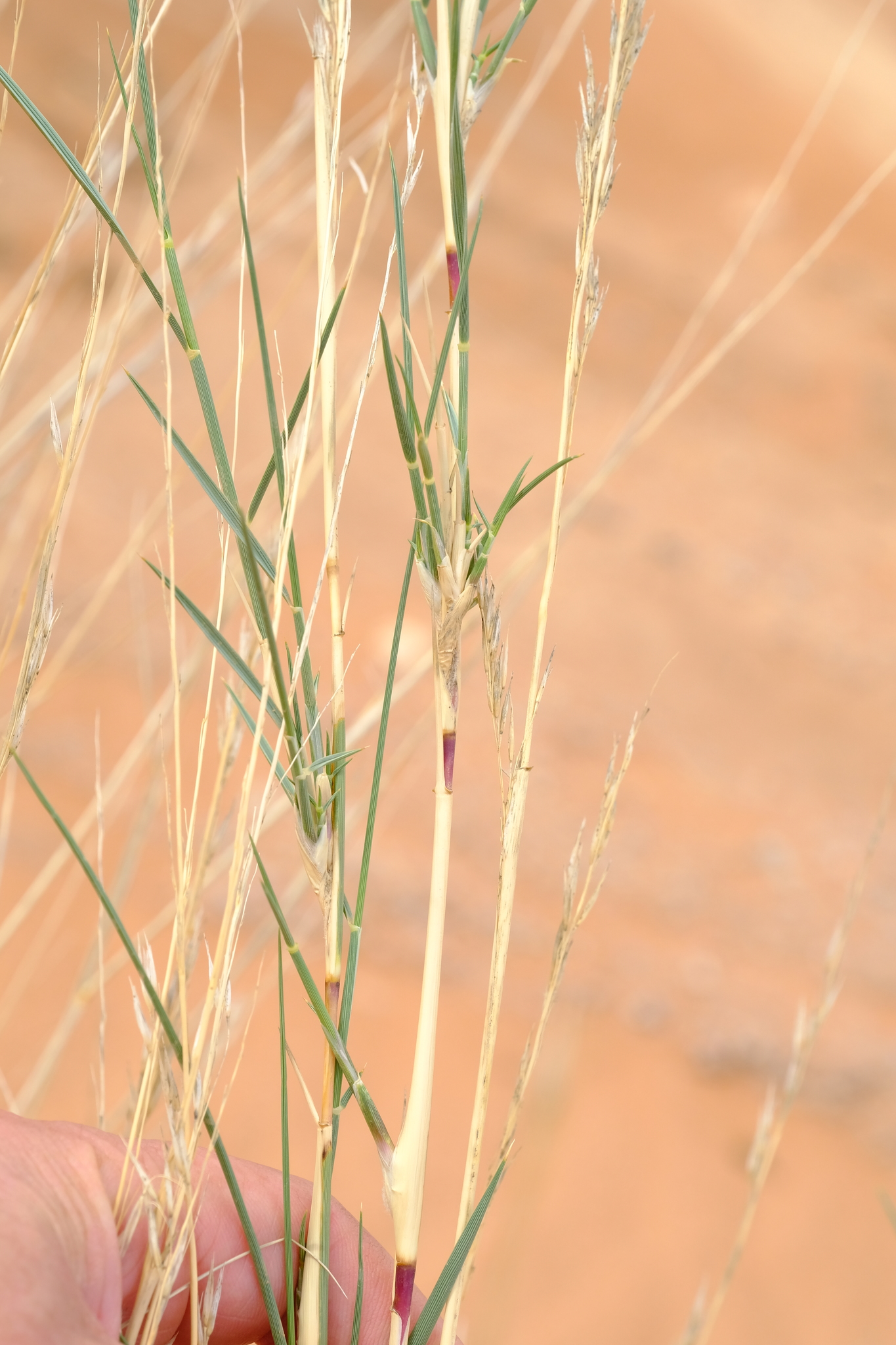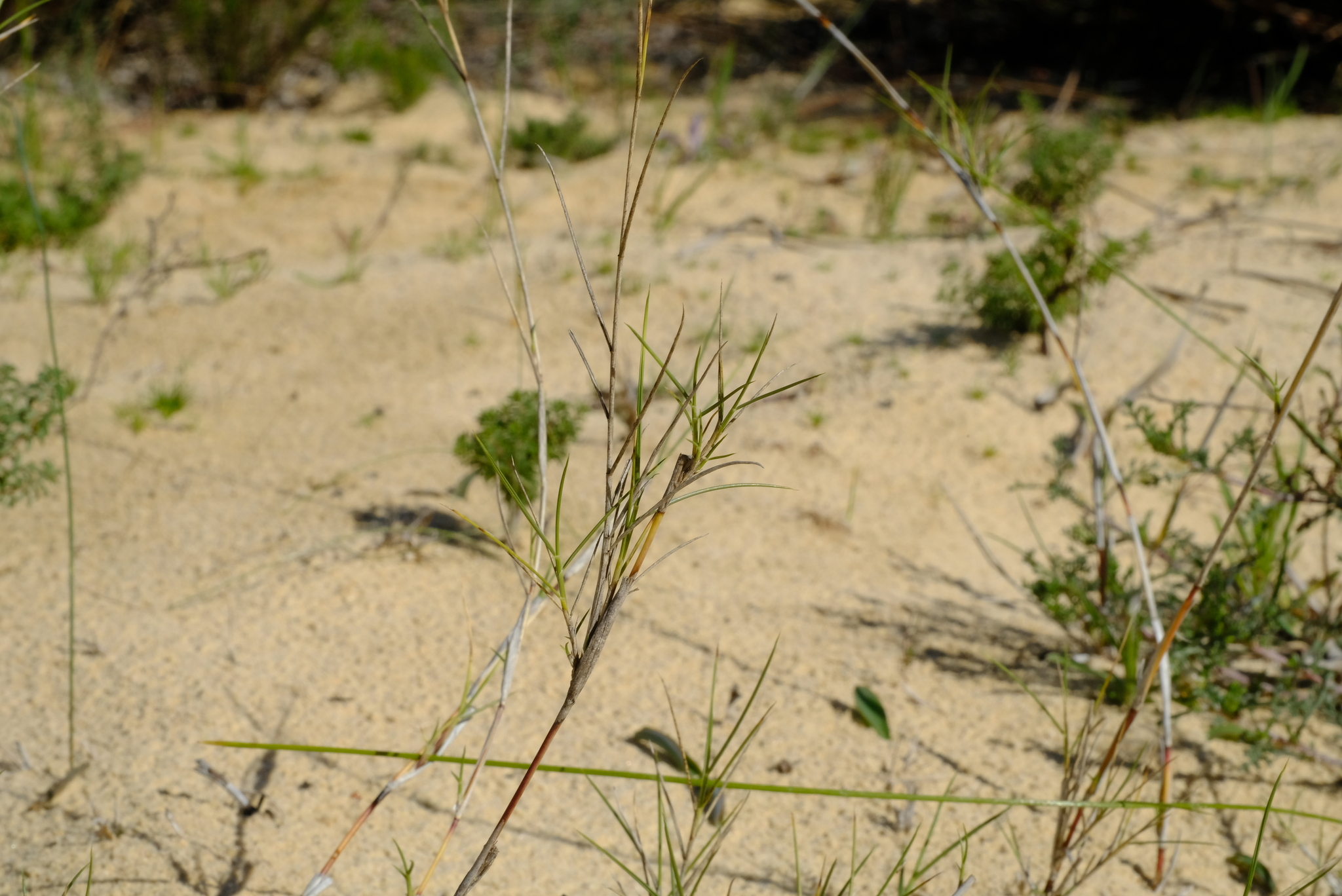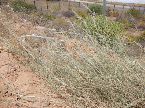 General notes: Relatively undisturbed road reserve in a faintly marked drainage line. Sand overlying calcrete. Very occasional - a few widely scattered clumps noted. Perennial, coarse, 165cm high. Much branched , with tufts of spiny leaves from the nodes, many of these with culms and panicles. Culms dark purple - conspicuous where exerted from the sheaths. Inflor. spike-like, spikelets straw-coloured.