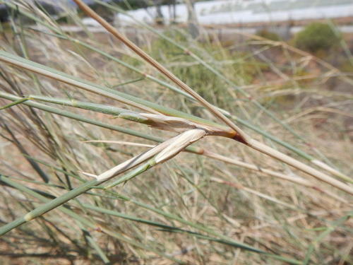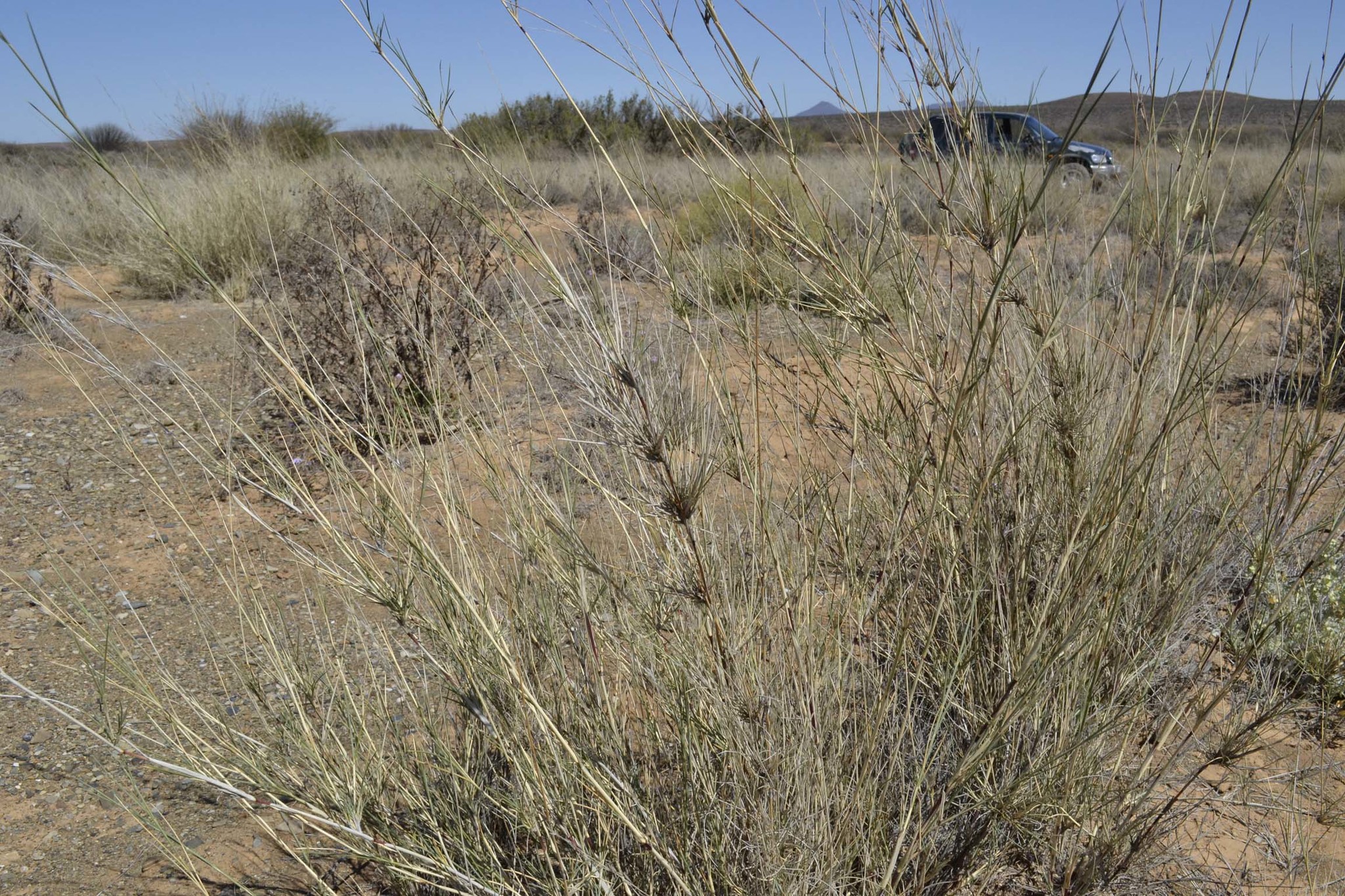 Perennial; robust to slender shrub or dwarf shrub; up to 2 m high; rhizomes long and strong; or densely tufted; plants glabrous and smooth; except for upper and basal leaf sheaths; which are appressed woolly hairy. Culms sprawling to erect; branches usually fascicled from nodes; rarely solitary. Leaf blades 60-100 mm long; setaceous; break off early; leaving sheaths; and exposing upper part of internode; which is usually dark; with characteristic banded appearance. Flowers: panicle elongate; contracted; interrupted; with spikelets clustered; spikelets 15-30 mm long; including awns; glumes straw-coloured; upper glume 10-14 mm long; lemma articulation at ± middle of lemma; a short; twisted beak present; all 3 awns plumose; callus 1.5 mm long; with naked; pungent apex. From: Retief, E; Meyer, NL. 2017. Poaceae. In: E Retief & NL Meyer (eds), Plants of the Free State: Inventory and identification guide. Strelitzia 38: 987-1107. South African National Biodiversity Institute, Pretoria. [CC BY]