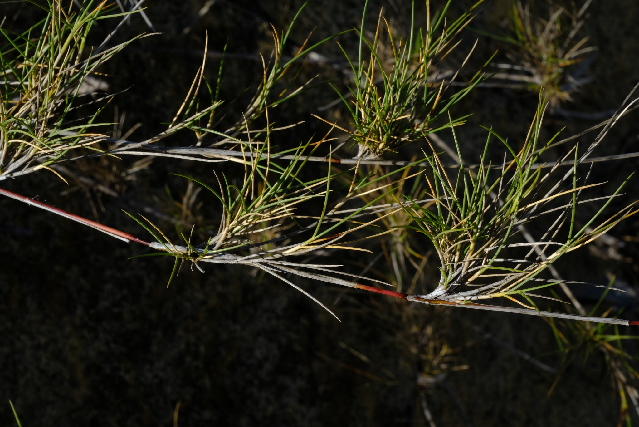 Tufted, robust to slender, shrub or dwarf shrub, up to 2 m high; rhizomes long and strong; upper basal leaf sheaths appressed woolly-hairy; culm branches usually fascicled from nodes, rarely solitary. Leaf blade 60-100 mm long, setaceous, breaks off early, leaving sheaths and exposing upper part of internode, which is usually dark, giving it a characteristic banded appearance; ligule a fringe of hairs. Inflorescence an elongate, narrow, interrupted panicle; spikelets clustered. Spikelets 10-14 mm long (excluding awn), disarticulating above glumes; glumes straw-coloured; upper glume 10-14 mm long. Floret 1; lemma indurated, articulation at ± middle of lemma, awns 3, all awns plumose, a short, twisted beak present; callus 1.5 mm long, with naked, pungent point. Flowering time Feb.-May, July-Dec. From: Fish, L; Bredenkamp, CL; Magwaza, ZL. 2019. Poaceae. In: CL Bredenkamp (ed.), A Flora of the Eastern Cape Province. Strelitzia 41(3): 1958-2104. South African National Biodiversity Institute, Pretoria. [CC BY]